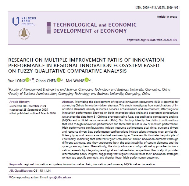 近日,中心人员龙跃教授及其硕士研究生陈启浩、王梅在“Technological and Economic Development of Economy”发表学术论文“RESEARCH ON MULTIPLE IMPROVEMENT PATHS OF INNOVATION PERFORMANCE IN REGIONAL INNOVATION ECOSYSTEM BASED ON FUZZY QUALITATIVE COMPARATIVE ANALYSIS”。