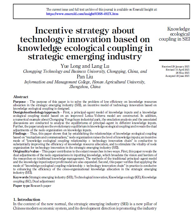 近日,中心人员龙跃教授及其硕士研究生卢琅在“kybernets”发表学术论文“Incentive strategy about technology innovation based on knowledge ecological coupling in strategic emerging industry”。
